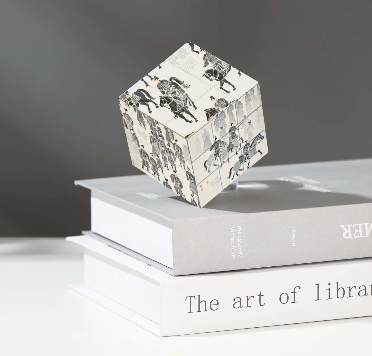 Each face features artwork or visual elements drawn from the exhibition identity, allowing the cube to function as a tactile puzzle as well as a collectible display object.